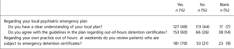 | Regarding your own practice out of hours: at weekends do you review patients who are subject to emergency detention certificates? | 181 (70) | 53 (21) | 23 (9) |