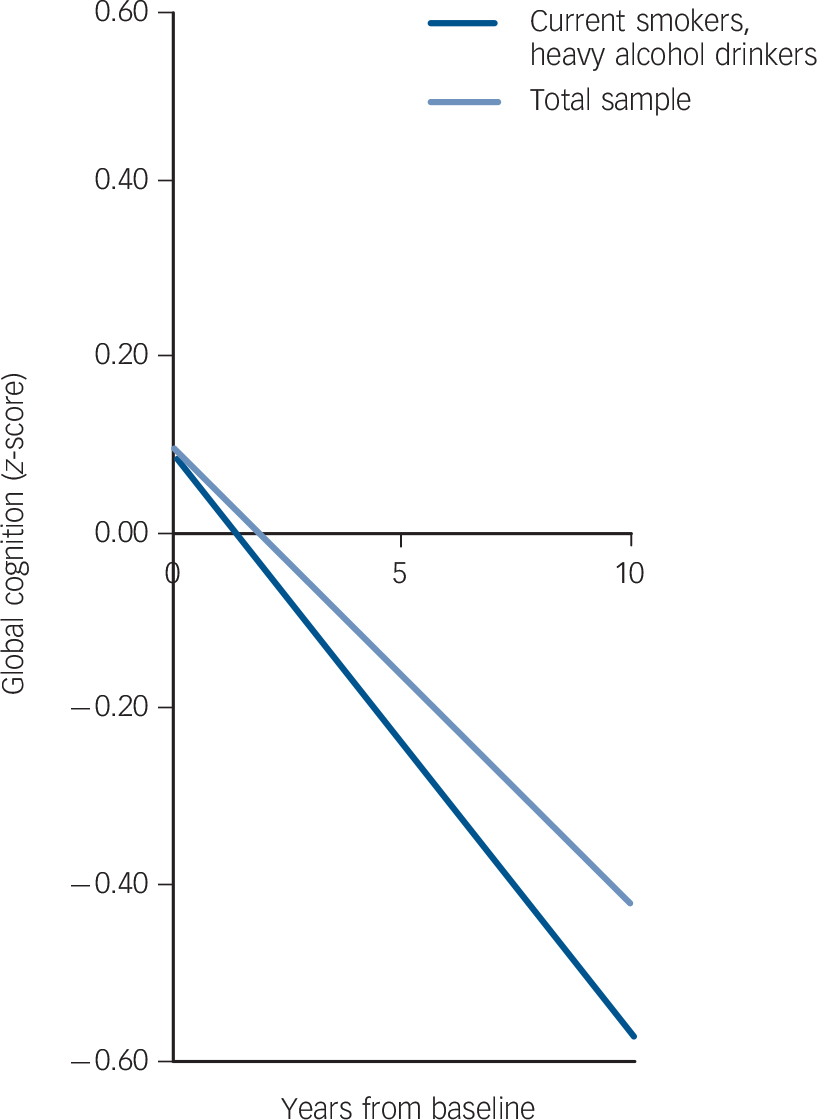 Fig. 1 Cognitive decline in the ‘current smoker, heavy alcohol drinker’ group compared with the total sample.