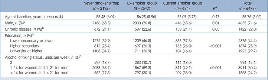 | Never smoker group (n = 3192) | Ex-smoker group (n = 2647) | Current smoker group (n = 634) | P Footnote a | Total (n = 6473) | |
