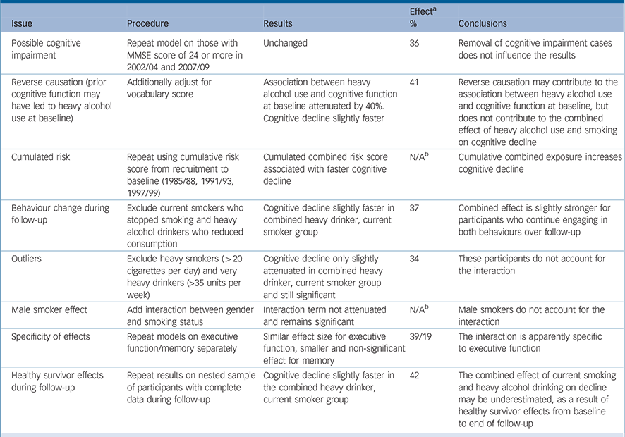 Several sensitivity analyses were performed. First, we repeated analyses among participants with an MMSE score of 24 or more Reference Anstey, Burns, Birrell, Steel, Kiely and Luszcz31 in 2002/04 and 2007/09 to ensure that results were not driven by possible cases of cognitive impairment. Second, we additionally adjusted results for the highest Mill Hill Vocabulary Test score obtained, to evaluate the impact of possible reverse causation. Reference Corley, Jia, Brett, Gow, Starr and Kyle35 Since vocabulary is resistant to cognitive decline, Reference Sabia, Elbaz, Dugravot, Head, Shipley and Hagger-Johnson9 it is often used as a measure of premorbid cognitive function. Third, we calculated a cumulative risk score for smoking, alcohol and their interaction from recruitment to baseline (1985/88, 1991/93 and 1997/99); to evaluate whether previous cumulative exposure was also associated with cognitive function and decline. Fourth, we evaluated the impact of behaviour change on results by excluding participants who changed their behaviour after baseline in 1997/99 (smokers who had stopped smoking or heavy alcohol drinkers who no longer drank heavily in 2002/04 and 2007/09). Fifth, we repeated the models after excluding participants who were very heavy drinkers (>35 units per week) 26 and heavy smokers (>20 cigarettes per day) at the same time, to evaluate their impact on results. Sixth, we added a term (male×smoking status) to the model to capture the previously reported association between current smoking and cognitive decline observed in men only, Reference Sabia, Elbaz, Dugravot, Head, Shipley and Hagger-Johnson9 to confirm results were consistent. Seventh, we repeated the models on each of the four cognitive tests, to evaluate whether patterns differed for memory compared with tests that involve executive function (reasoning, semantic and phonemic fluency). Eighth, we repeated the analysis on a nested sample of participants with complete data from baseline to follow-up. Similar results among those with complete v. missing data would provide evidence against a healthy-survivor effect. Finally, we also compared models including participants reporting no alcohol use in the past 7 days but regular use at other times (occasional drinkers) with those reporting no use at other times (non-drinkers), to evaluate whether heterogeneity in the ‘0 alcohol units per week’ group influenced our findings.