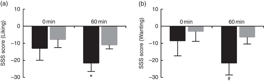 Fig. 3 Sweet sensory-specific satiety (SSS) score for low sweet sensitivity (LS, ) and high sweet sensitivity (HS, ) groups at 0 and 60 min. (a) Sweet SSS score calculated with liking ratings; and (b) sweet SSS score with wanting ratings. Values are means (n 30), with their standard errors represented by vertical bars. Significant difference when comparing the two groups at a certain time: # P<0·1, * P<0·05.