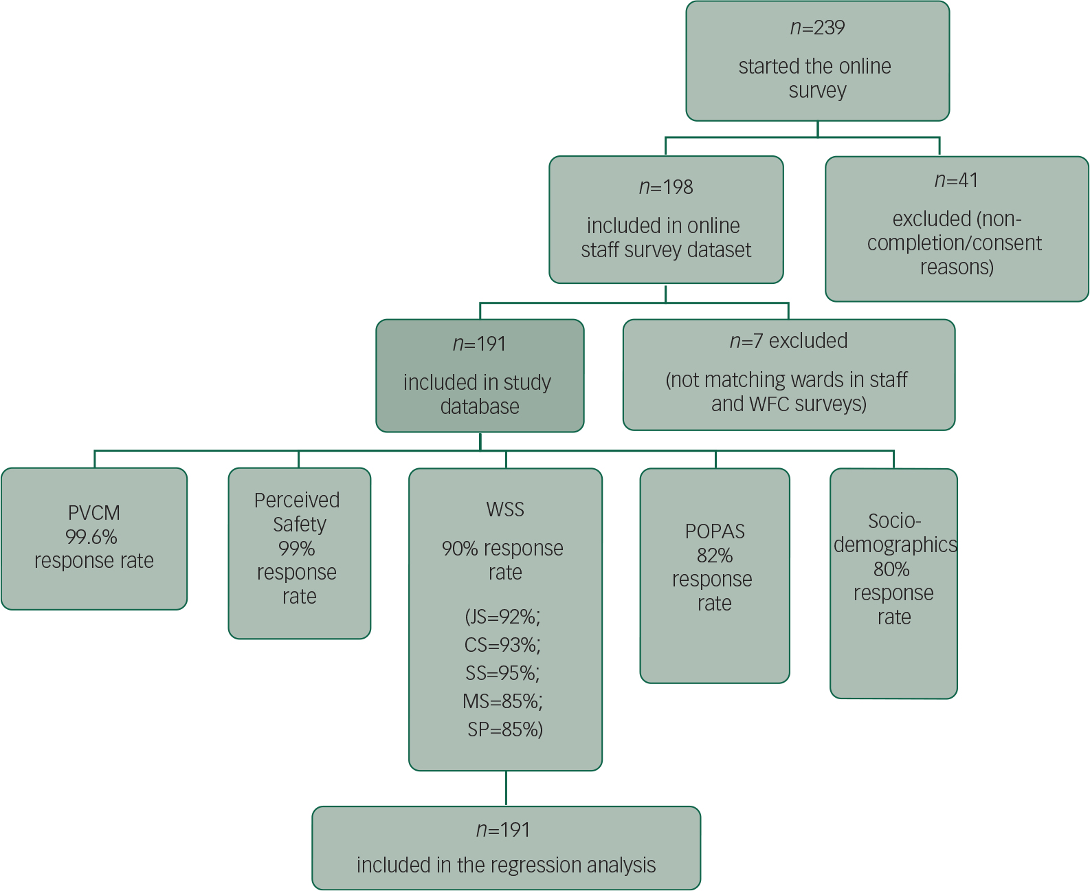 Fig. 1 Flowchart of study participants included in the analysis. POPAS, Perceptions of Prevalence of Aggression Scale; PVCM, Perceived Violence Climate Measure; WFC, Ward Features Checklist; WSS, Work Safety Scale.