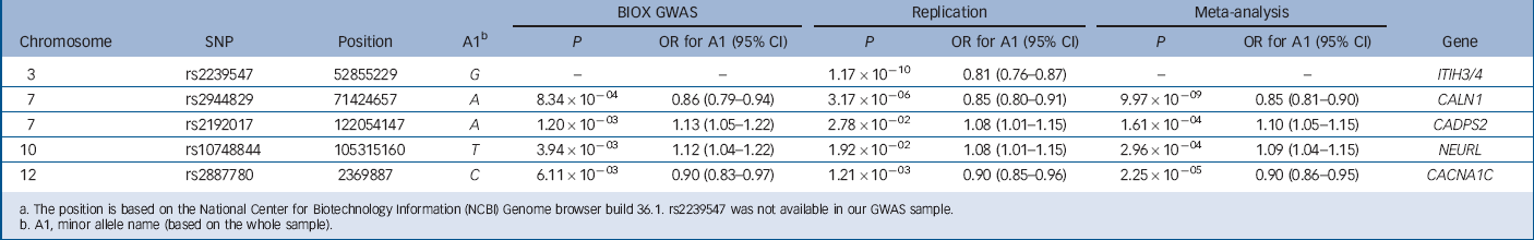 TABLE 1 Summary of the Han Chinese population (BIOX) genome-wide association study (GWAS), replication and meta-analyses for the top five most significant single nucleotide polymorphisms (SNPs) a