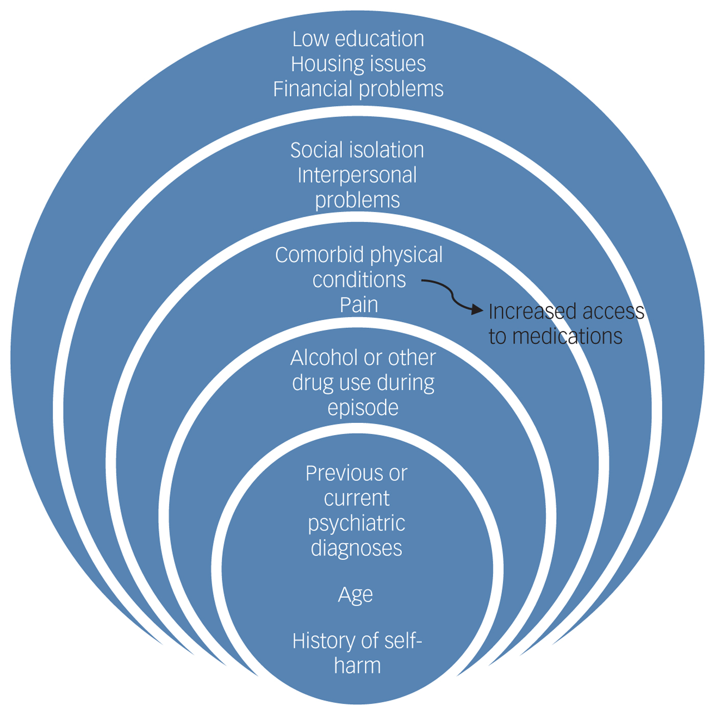 Our findings are in line with NICE guideline CG1672 suggesting that identifying and managing older adults, whose self-harm is different from that in younger populations, is vital due to the increased risk of repetition and suicide in this population. Clinicians have the potential to intervene and prevent self-harm in older adults as frequent contact with health services is reported. This includes potential opportunities to reduce self-harm repetition (with resource implications, particularly for post-episode treatment), suicide and premature death.Reference Carr, Ashcroft, Kontopantelis, While, Awenat and Cooper73 In particular, it is important that clinicians prescribing antidepressants (among other medications) are aware of the increased risk of self-harm in this population and ensure adequate follow-up is in place. The model developed through this review offers the potential to inform clinicians about the possible influencing factors for self-harm in older adults (Fig. 1). However, it should not be used alone as other existing factors may not have been captured in the model given the limited hospital-based context of the majority of studies included in this review.