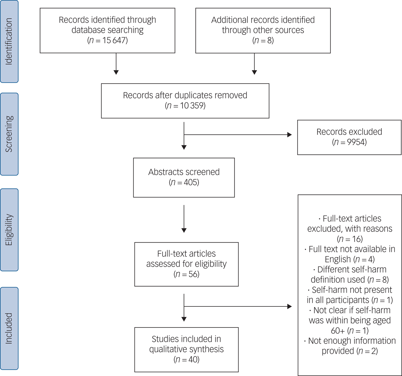 A comprehensive search strategy was developed and used to search electronic databases (AgeLine, CINAHL, PsycINFO, MEDLINE and Web of Science) for published studies on self-harm in older adults. Databases were searched from their inception until 28 February 2018 (for full search strategy, see Supplementary Appendix 1 available at https://doi.org/10.1192/bjp.2019.11). Additionally, hand searching of reference lists of included studies was carried out to identify other potentially relevant grey literature. No language restrictions were applied.