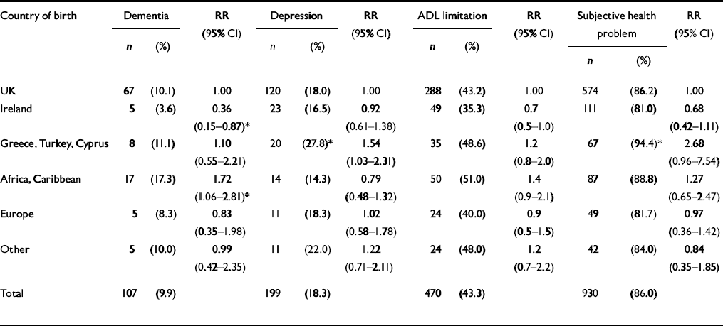 | Country of birth | Dementia | RR (95% CI) | Depression | RR (95% CI) | ADL limitation | RR (95% CI) | Subjective health problem | RR (95% CI) | ||||