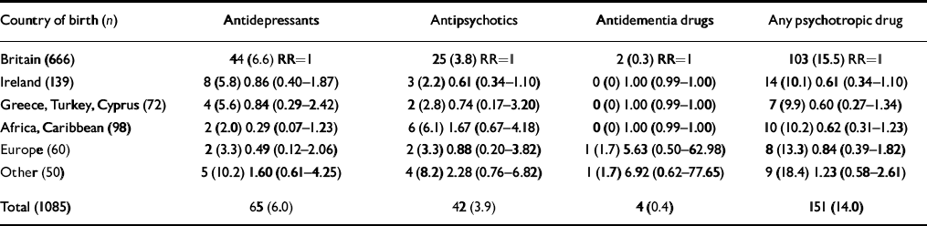 Table 4 shows those taking psychotropic medication. This did not vary significantly according to country of birth, although those born in Cyprus took psychotropics less than those born in any other country. Taking psychotropic medication was associated significantly with contact with psychiatric services: 14 (73.6%) of those in contact with services v. 137 (14.8%) of those not (P<0.001, RR=18.91; 95% CI 6.70-53.31). Most people (34/42) taking antipsychotics said that they had not been in contact with psychiatric services in the past 3 months, as did most of those taking antidementia drugs (3/4).