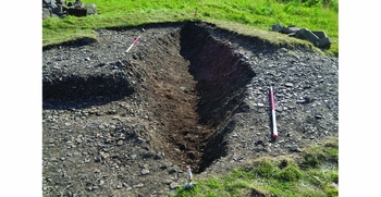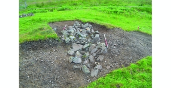 The site was initially recorded as a low-lying mound close to the foreshore, respected by later rig-and-furrow agriculture. Excavation established that the mound itself was natural, with a central, cut feature, within which a substantial number of medium to large stones had been placed in a boat-shaped setting, including two layers of kerbing around the edge of the cut. The arrangement measured 5.2 × 1.7m at its widest point and was orientated west-south-west to east-north-east (Figure 2). A spearhead and shield boss were recovered from amongst the stones, presumably included as part of the process of closing the grave.