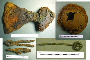 Figure 6. Some of the other finds recovered from the grave (clockwise from the top left): broad-bladed axe, shield boss, ringed pin and the hammer and tongs (photographs: Pieta Greaves/AOC Archaeology).