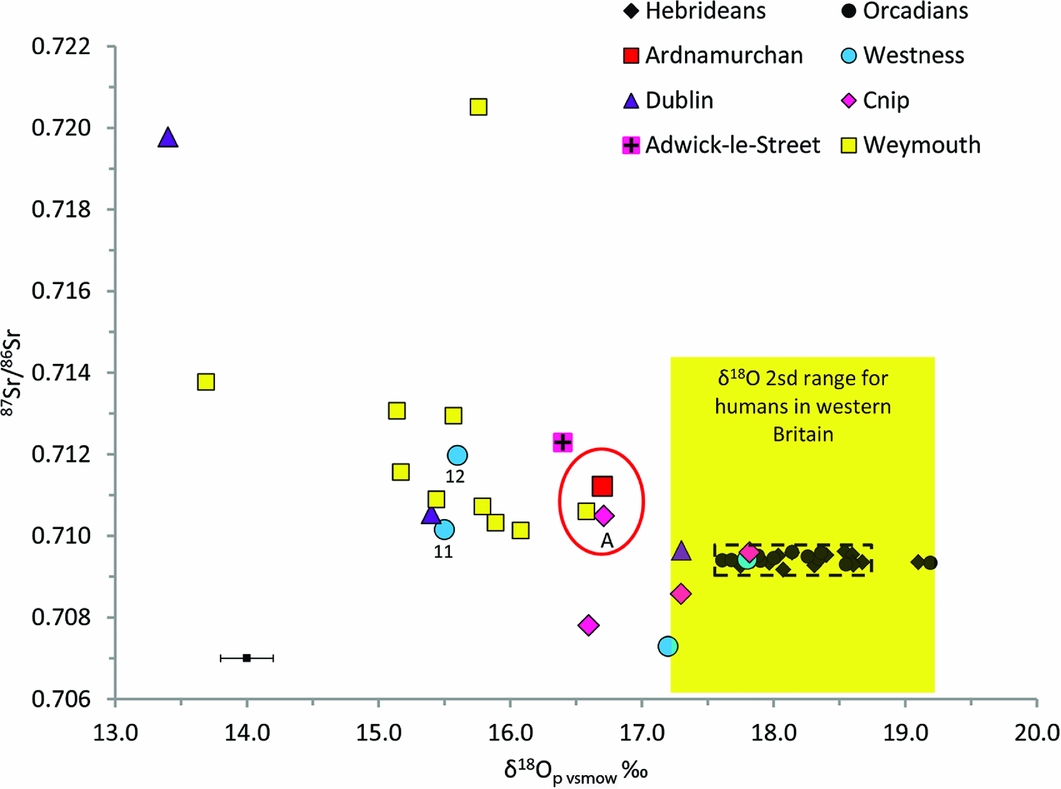 Figure 10. Enamel strontium and phosphate oxygen isotope data for the Ardnamurchan burial compared to data for other Viking-period burials in Britain and Ireland. The estimated range indicated by the yellow box for biosphere strontium in the Ardnamurchan peninsula is taken from Evans et al. (Reference Evans, Montgomery, Wildman and Boulton2010) and the range (again in the yellow box) of δ18O for western Britain from Evans et al. (Reference Evans, Chenery and Montgomery2012).
