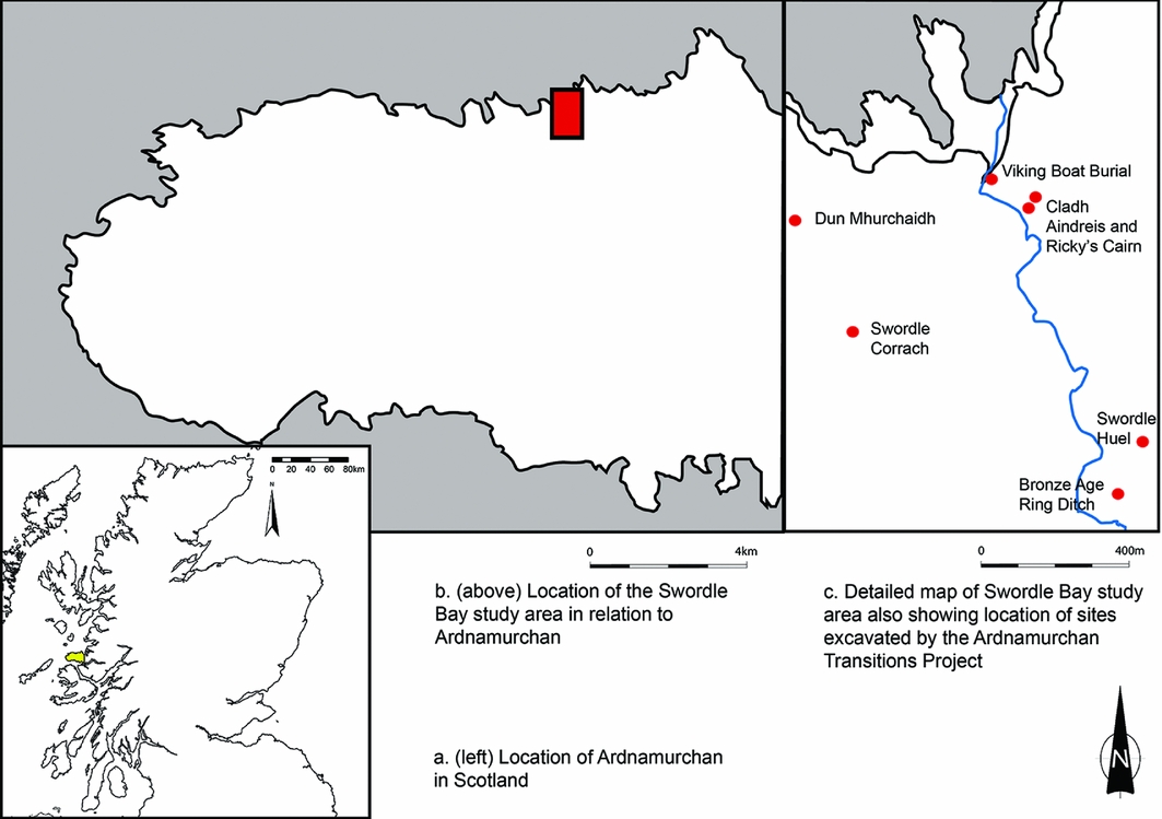 The Ardnamurchan boat burial represents the first excavation of an intact Viking boat burial by archaeologists on the UK mainland, and it makes a significant addition to our knowledge of burial practices from this period. The uncovering of such a burial also offers opportunities for multi-scalar analysis, from local and regional connections on the one hand, to the momentary act of depositing an object next to a body, or breaking a spear and placing it in the grave on the other. In this article, we have begun to trace some of these scales, including the connections evident to Scandinavia and Ireland in the objects, and how the isotopic profile suggests a varied history of diet and connections away from Swordle Bay. We have also touched on the way the boat burial brings together not only multiple geographic connections, but also some that cross time, reaching back into prehistory and forwards to our work as archaeologists in the present. Much more remains to be said, not least about the ritual process of the funeral and the detailed performances that took place there. Critically, when considering a burial like this, it is essential to remember that each of these objects, and each of these actions, was never isolated, but rather they emerge out of, and help to form, an assemblage that knits together multiple places, people and moments in time.