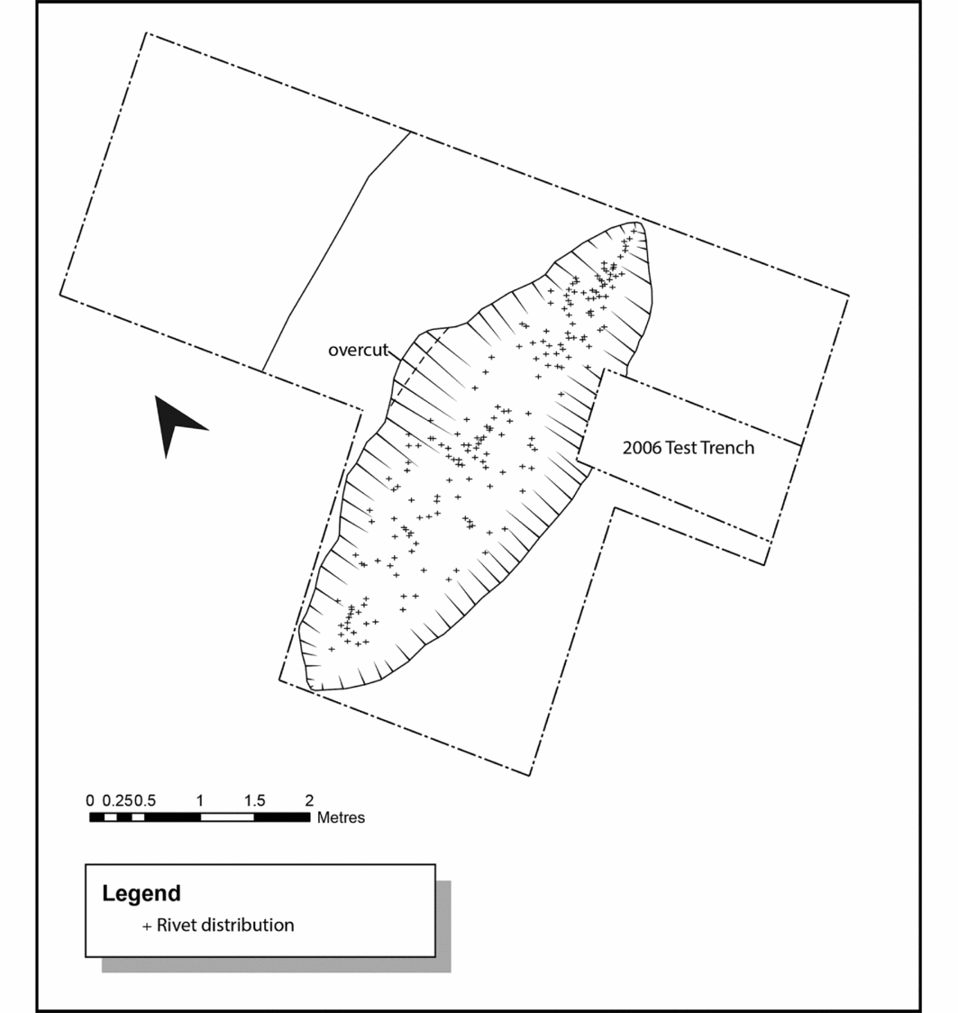 The vessel itself survived in the form of 213 rivets recovered in situ and recorded three-dimensionally (Figure 4); a handful more had been disturbed. This was clearly an intact craft measuring approximately 5.1m in length and would have been a small rowing boat, probably accompanying a larger ship, rather than being a serious sea-going craft. The survival of mineralised wood connected to the decaying rivets should allow further information about the boat to emerge in due course.