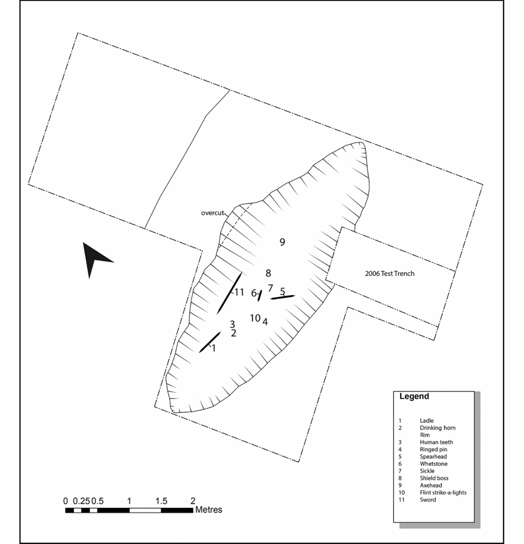At the base of the feature, two finds-rich layers provided extensive evidence for the rivets of a complete, clinker-built boat containing numerous grave goods. These included a sword, an axe, a large ladle containing a hammer and tongs, a drinking horn mount, a ringed pin, a sickle, a whetstone and flint strike-a-lights. Unlike the spear and shield, these items appear to have been placed next to the interred individual. The upper of the two layers also contained two teeth: both molars from the same individual. These were the only identified human remains, the rest of the body having probably decayed in the acidic soil; the location of the teeth suggests the head was towards the west end of the boat.