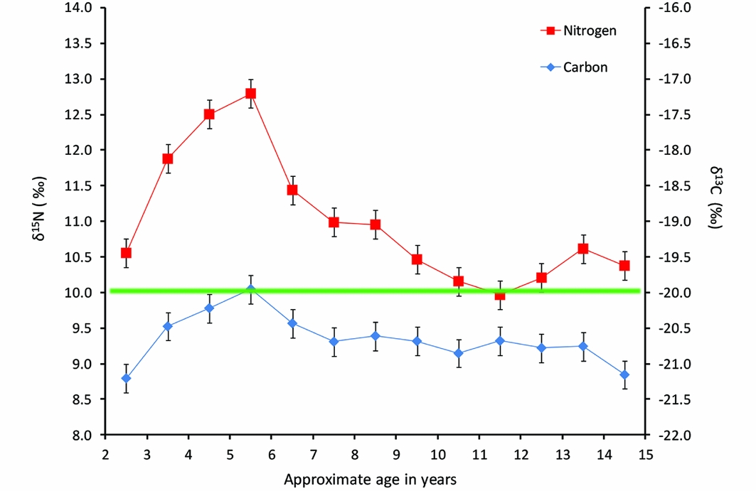 Results indicate that the individual consumed a largely terrestrial diet up to the age of 15, with a period of increased marine protein consumption between the ages of 3 and 5 (Figure 9). Isotopic evidence for marine protein consumption by humans is rare in Britain in the first millennium AD, even at coastal sites (Barrett & Richards Reference Barrett and Richards2004; Müldner & Richards Reference Müldner and Richards2007; Müldner et al. Reference Müldner, Montgomery, Cook, Ellam, Gledhill and Lowe2009; Buckberry et al. Reference Buckberry, Montgomery, Towers, Müldner, Holst, Evans, Gledhill, Neale and Lee-Thorp2014; Curtis-Summers et al. Reference Curtis-Summers, Montgomery and Carver2014), but both non-marine and marine protein consumers are found in Viking Age Norway; children appear to eat less marine protein than adults (Kosiba et al. Reference Kosiba, Tykot and Carlsson2007; Naumann et al. Reference Naumann, Price and Richards2014). Evidence for marine consumption in childhood may indicate that the individual was living on or close to the coast.