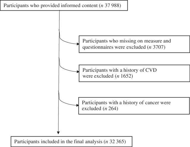 This cross-sectional study used data from Tianjin Chronic Low-grade Systemic Inflammation and Health cohort ranging from 2013 to 2016. The participant selection process is described in Fig. 1. During the survey period, there were 37 988 subjects aged over 18 years who had received health examinations and handgrip strength test and participants were asked to answer questionnaires that included questions relating to their lifestyle and provided written informed consent for their data to be analysed. We excluded participants with incomplete measurement results and questionnaires (n 3707), or those with a history of CVD (n 1652) or cancer (n 264). As a result of these exclusions, the final cross-sectional study population comprised 32 365 subjects.