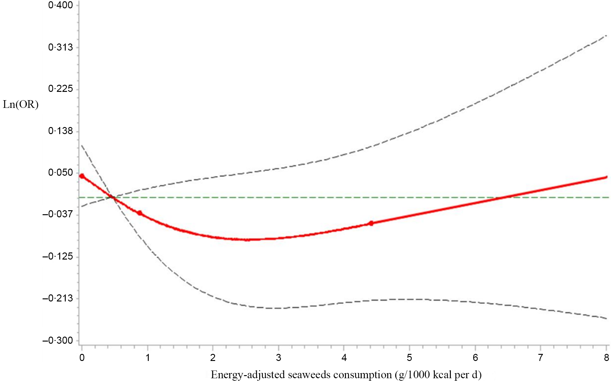 Fig. 3 Restricted cubic spline models representing the associations of seaweeds consumption (g/1000 kcal per d) with OR for prevalence of hyperuricaemia (HUA) in males, after adjusting for age, BMI, smoking status, alcohol consumption status, education level, employment status, household incomes, physical activity, hypertension, hyperlipidaemia, diabetes, total energy intake and dietary patterns (seaweeds intake was not included in the calculation). The reference value for seaweeds consumption (g/1000 kcal per d) was 0·47 g/1000 kcal per d. The three knots were set at 5th, 50th and 95th percentiles. Estimation;  Lower_CL;