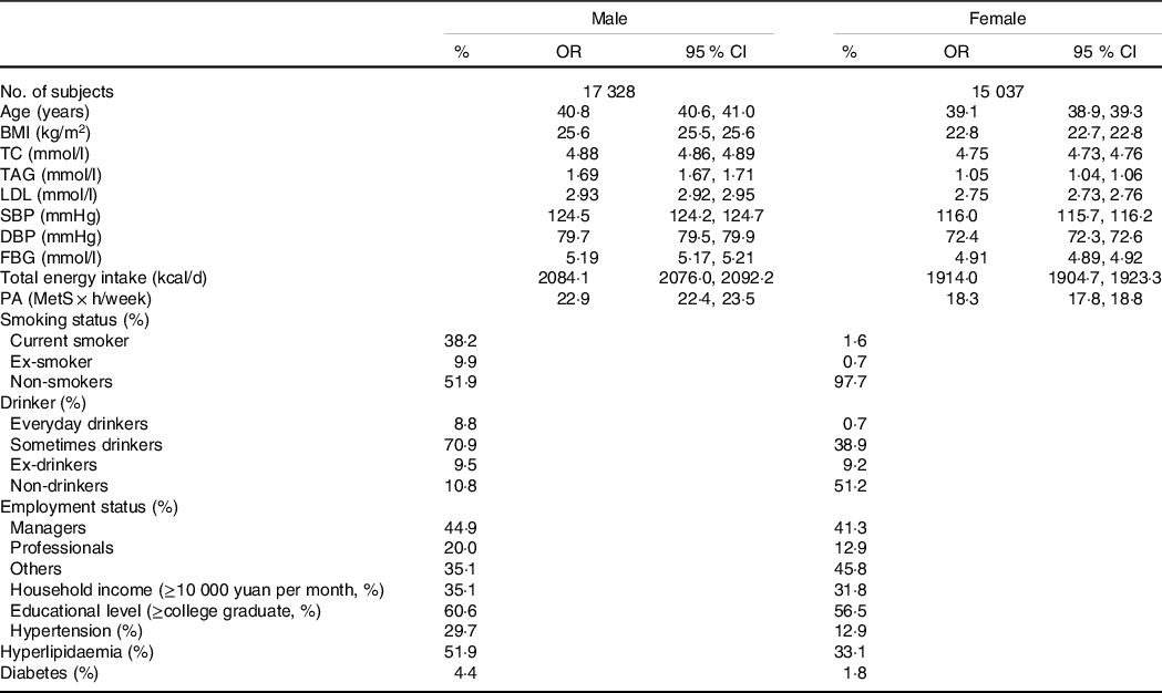 Participant characteristics delineated by sex are summarised in Table 1. A total of 32 365 participants (17 328 men and 15 037 women) were enrolled in the cross-sectional study, and the prevalence of HUA was 14·10 % (21·17 % in men and 5·93 % in women). Compared with females, males had a higher BMI, total cholesterol, TAG, LDL, systolic BP, diastolic BP and fasting blood glucose. They were also more likely to engage in PA, consumed more total energy and had higher sweet food pattern score and animal food pattern score. In addition, males were more likely to be smokers and drinkers. Compared with females, males were more highly educated, were more likely to be managers, had a higher income and had a higher prevalence of hypertension, hyperlipidaemia and diabetes.