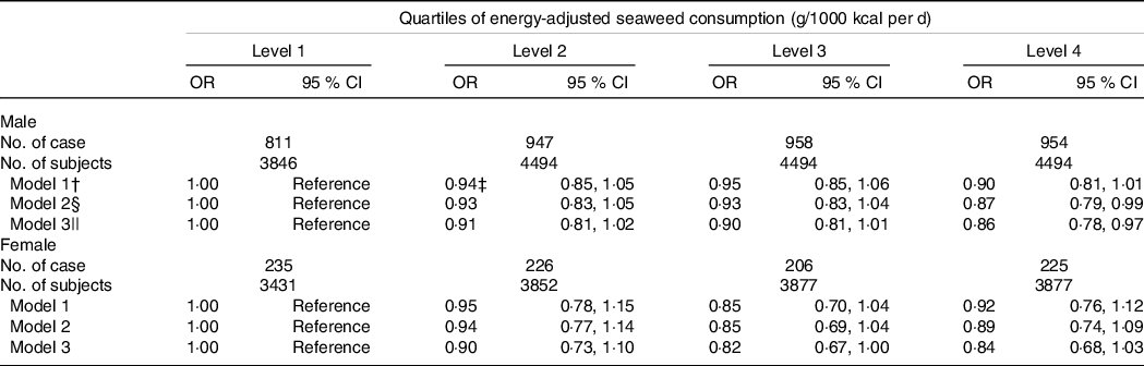 The FFQ included an item about typical seaweed intake and contained seven frequency categories for seaweeds (Wakame, Konbu, Nori and more): almost never or rarely, <once per week, once per week, 2–3 times/week, 4–6 times/week, 1 time/d and ≥2 times/d. Consumption of seaweeds was calculated by multiplying portion sizes by the frequency at which each food item was consumed per d. To correct for potential measurement error, total seaweed consumption was adjusted for total energy intake according to the nutrient density method and expressed as g/1000 kcal per d(Reference Willett, Howe and Kushi27). For analysis, we summarised the categories of seaweeds in quantiles in the following way: <0·52 g/1000 kcal per d for level 1, 0·52–0·93 g/1000 kcal per d for level 2, 0·94–1·55 g/1000 kcal per d for level 3 and >1·55 g/1000 kcal per d for level 4 in males; and <0·47 g/1000 kcal per d for level 1, 0·47–0·87 g/1000 kcal per d for level 2, 0·88–1·52 g/1000 kcal per d for level 3 and >1·53 g/1000 kcal per d for level 4 in females.