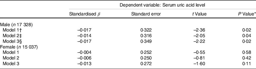 Multiple linear regression models were used to confirm the association between seaweeds consumption and serum uric acid level (Table 3). After adjusting for multiple confounding factors, significant associations between seaweeds consumption and serum uric acid level in males (standard regression coefficient = –0·017, P = 0·02) were observed. However, we found no significant association in females (standard regression coefficient = –0·01, P = 0·11).