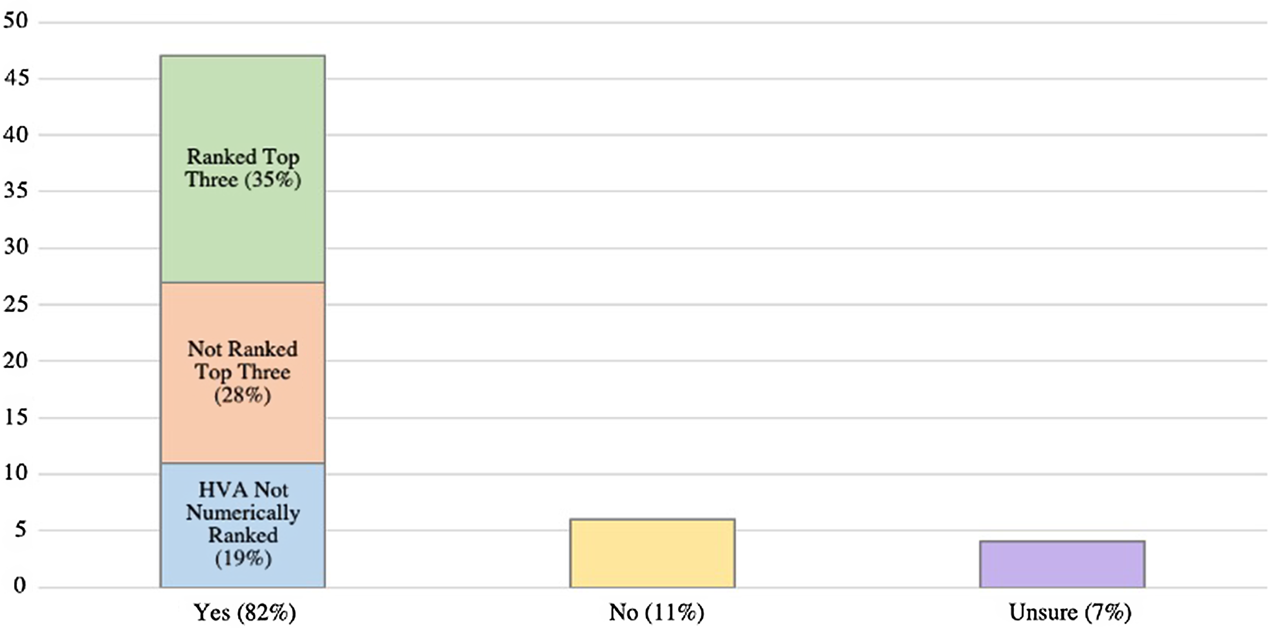 A majority of hospital systems surveyed included cybersecurity disasters in their HVA (82.4%; 47/57), with 4 respondents unsure as to whether there was an entry. Of those who affirmed there was a cybersecurity disaster entry in their HVA, 57.4% ranked it as 1 of their top 5 priorities (27/47).