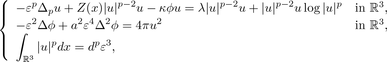 \begin{equation*}\left\{\begin{array}{ll}\displaystyle -\varepsilon^p\Delta_p u+Z(x)|u|^{p-2}u-\kappa\phi u=\lambda |u|^{p-2}u+|u|^{p-2}u\log|u|^p& \text{in} \ \mathbb{R}^3, \\\displaystyle -\varepsilon^2\Delta\phi+a^2\varepsilon^4\Delta^2\phi=4\pi u^2& \text{in} \ \mathbb{R}^3, \\\displaystyle \int_{\mathbb{R}^3}|u|^pdx=d^p\varepsilon^3,\end{array}\right.\end{equation*}